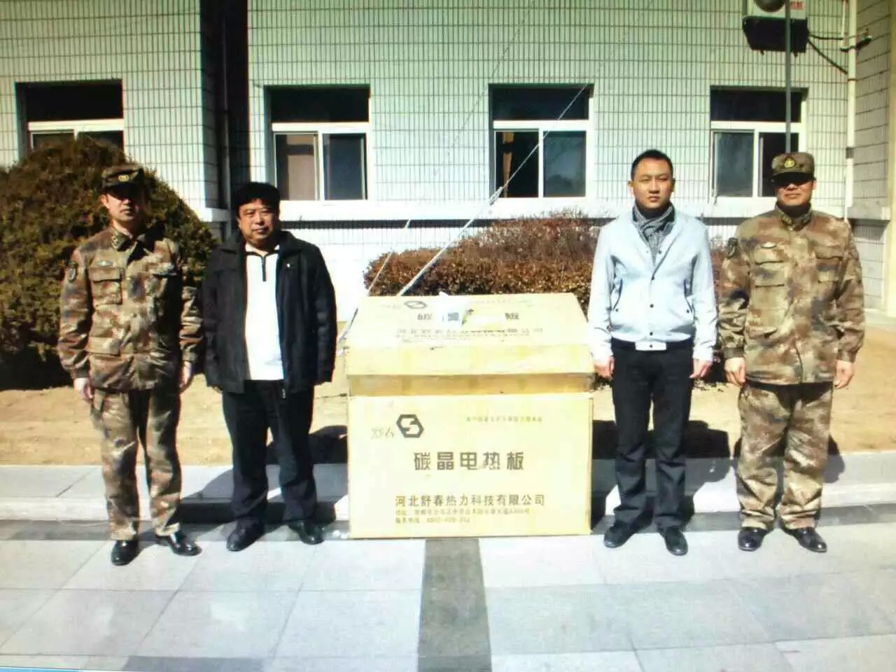 舒春走進軍營 2016年3月10日河北舒春公司走進承德市平泉縣66435部隊,為哨所免費安裝了一萬多元的碳晶電熱板,給軍營送去了溫暖。