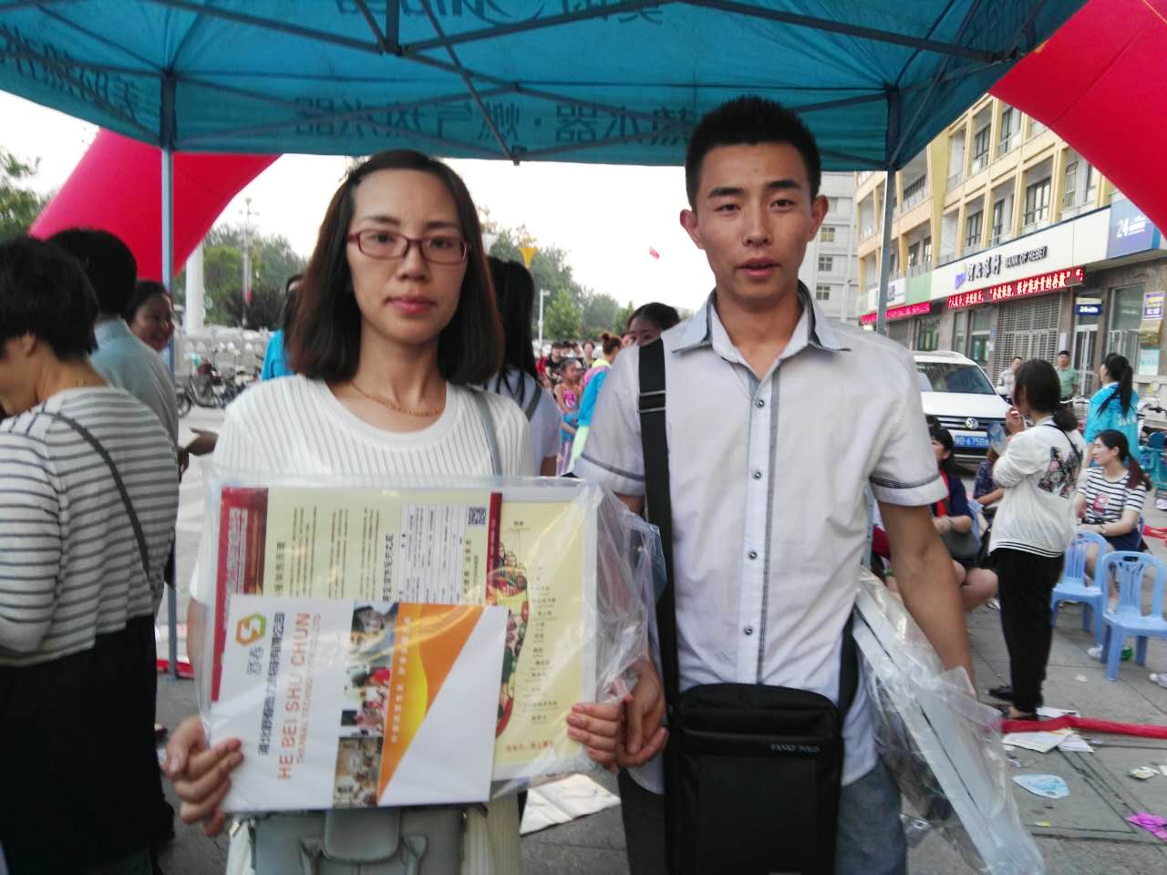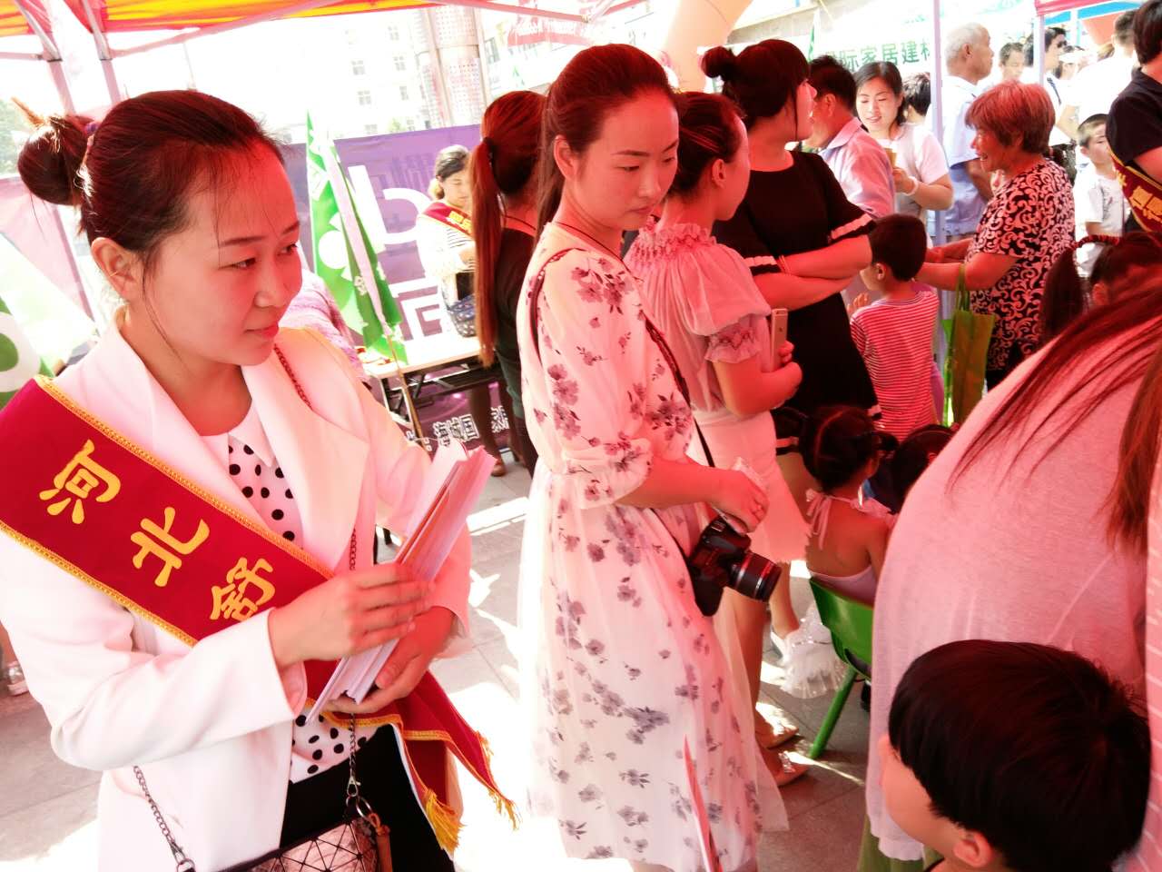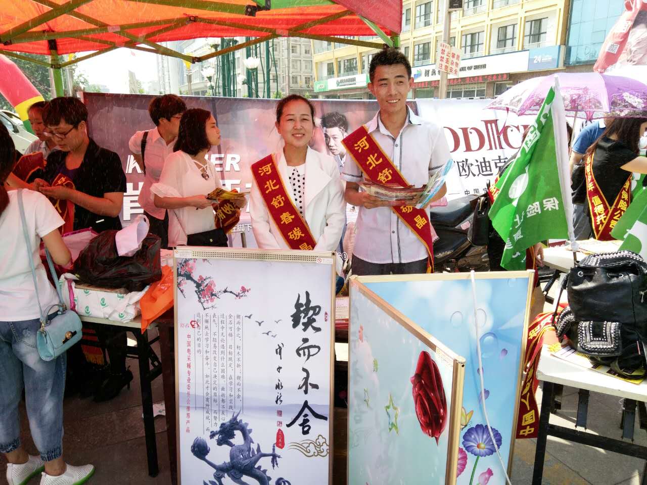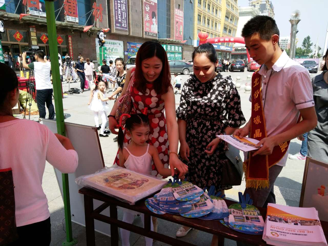 我公司工作人員向大家發(fā)放宣傳單冊和消暑工具。