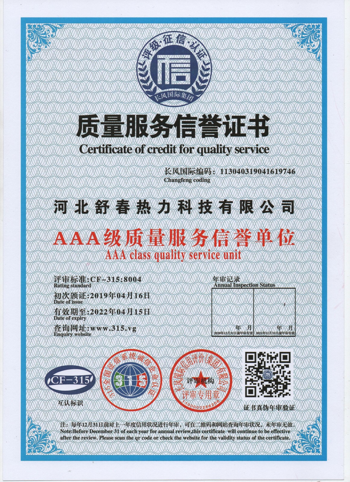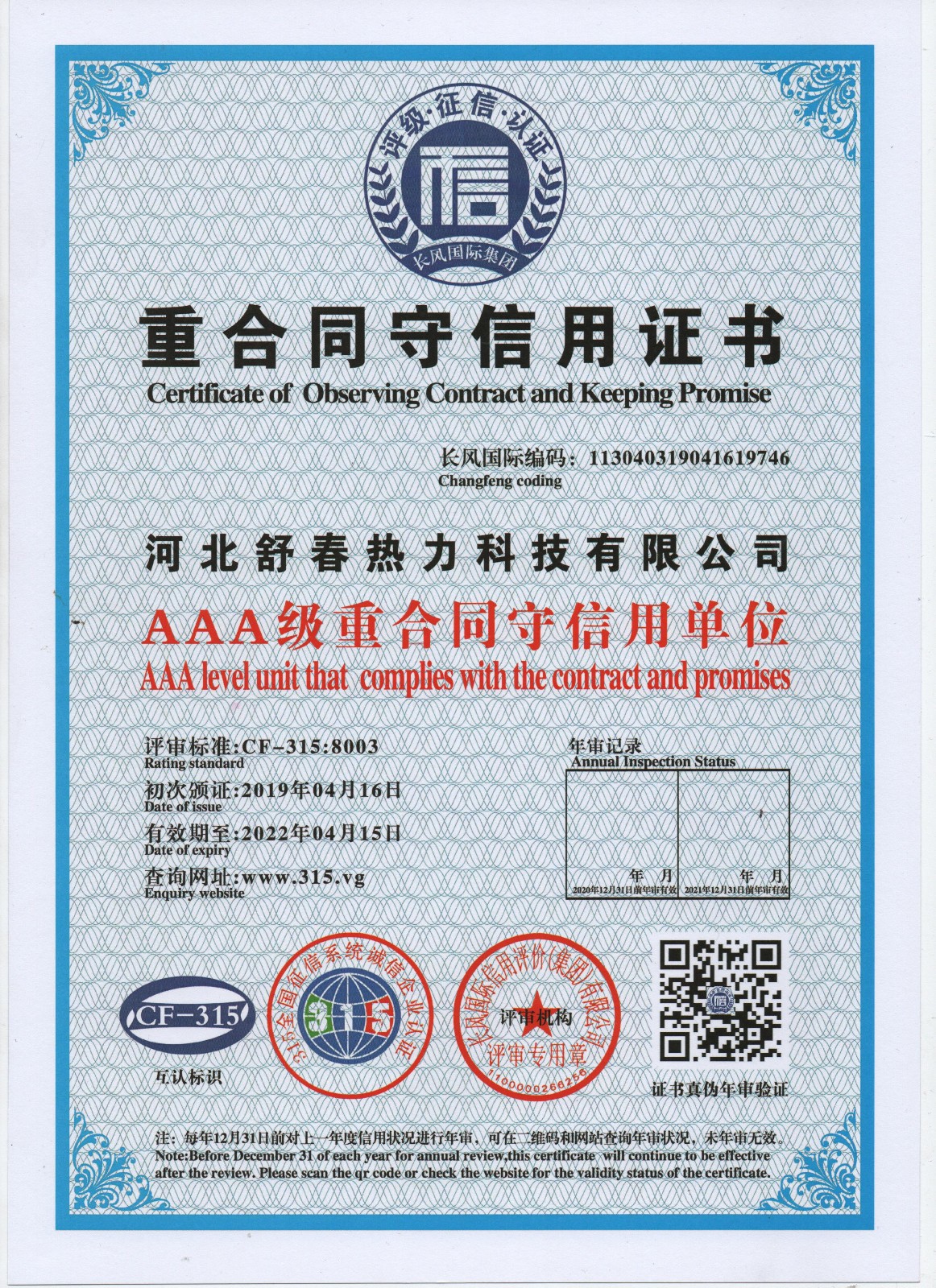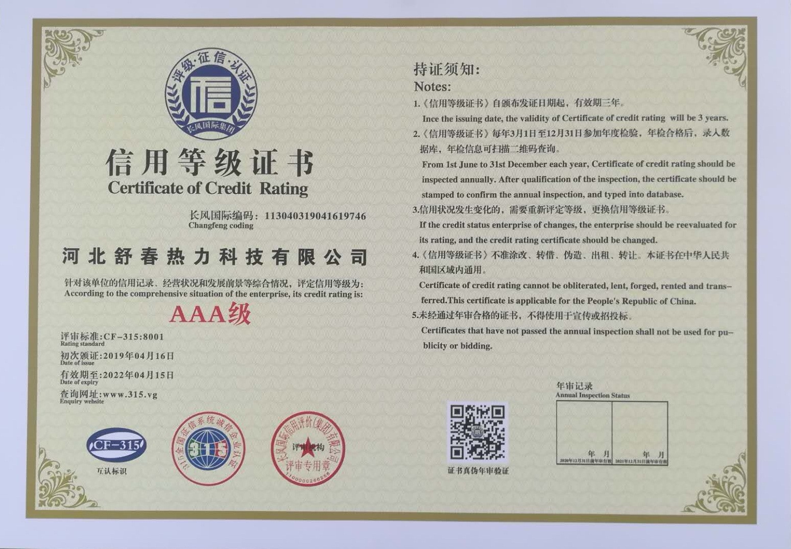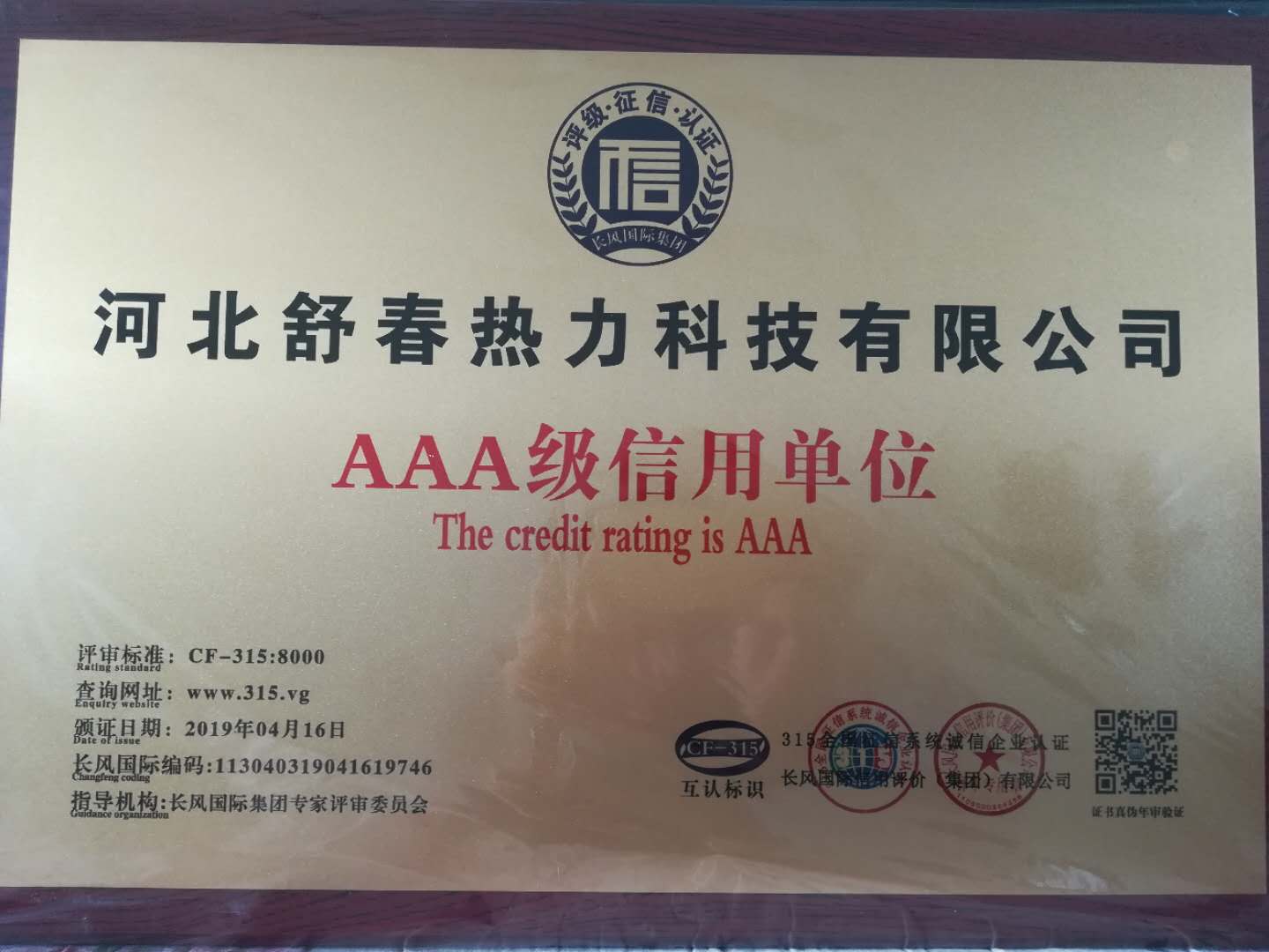 AAA級信用單位,舒春真誠對待每一個人 2019年4月16日,河北舒春熱力科技有限公司取得了AAA級信用單位、誠信經理人、誠信企業(yè)家、AAA級質量服務信譽單位、 AAA級重合同守信用單位、AAA級誠信經營示范單位、AAA級資信等級、AAA級信用等級。 |