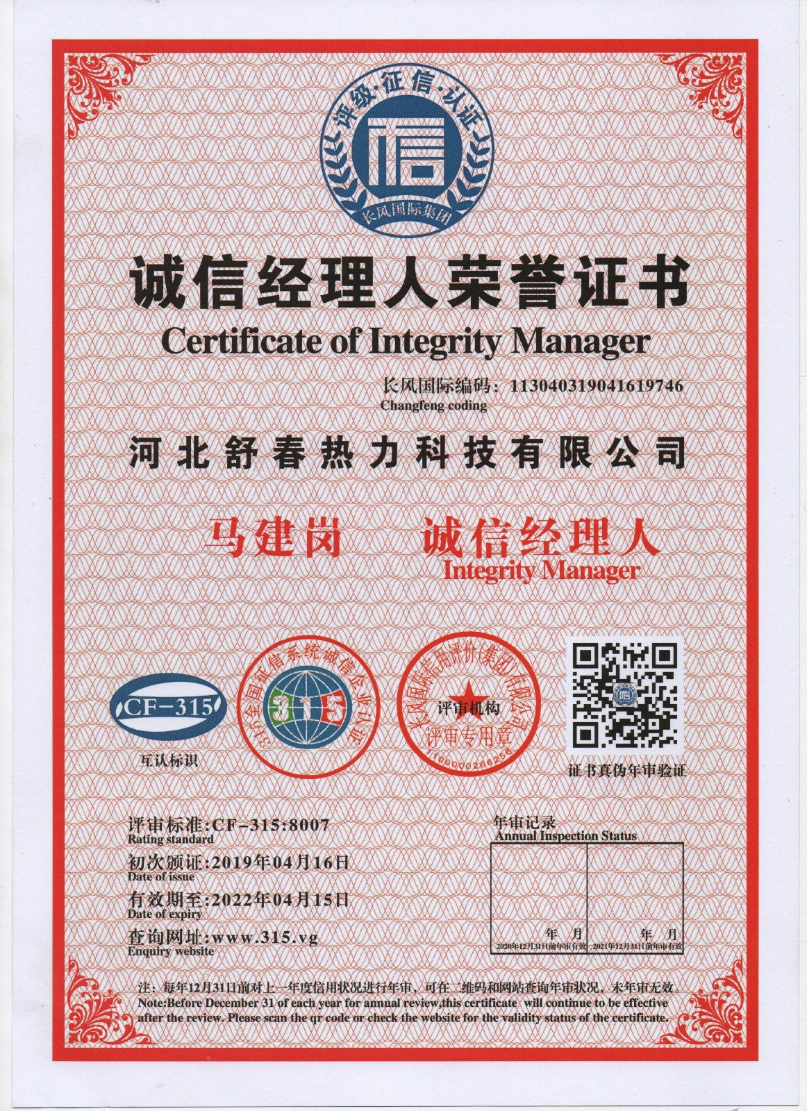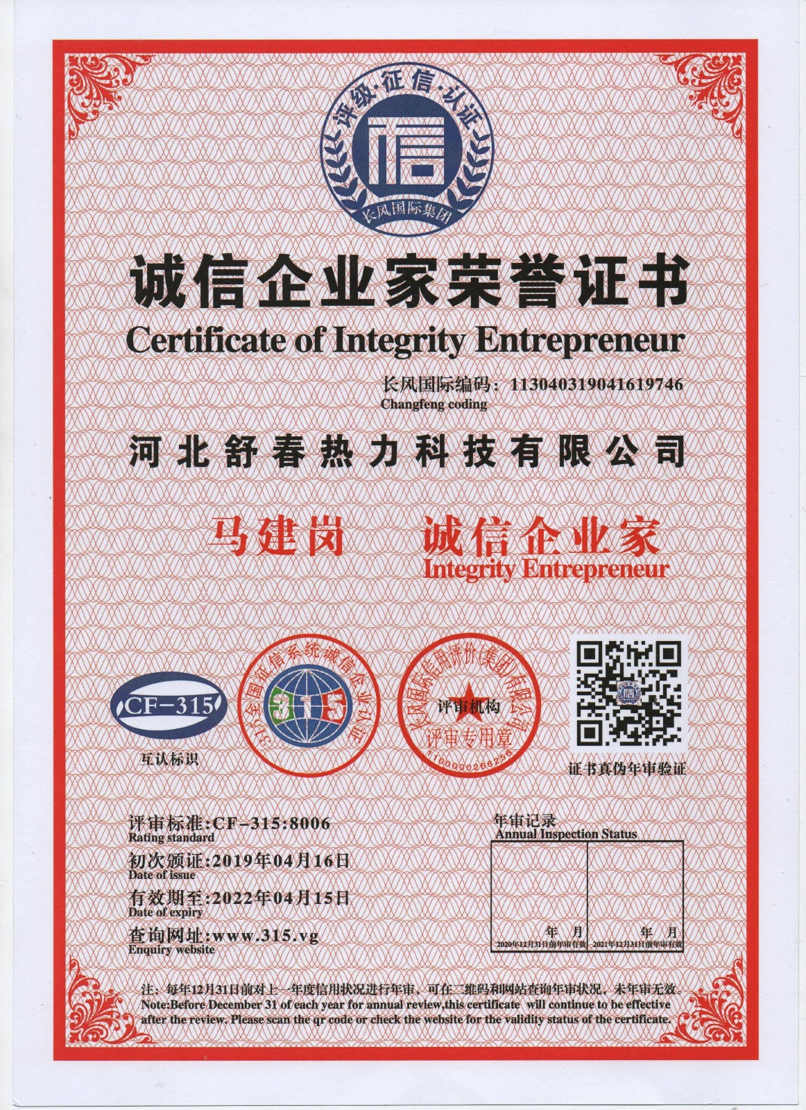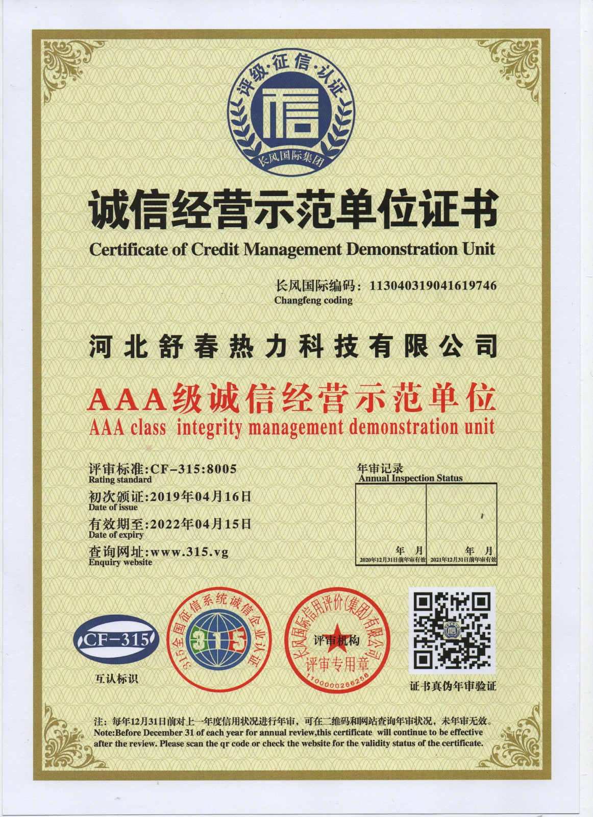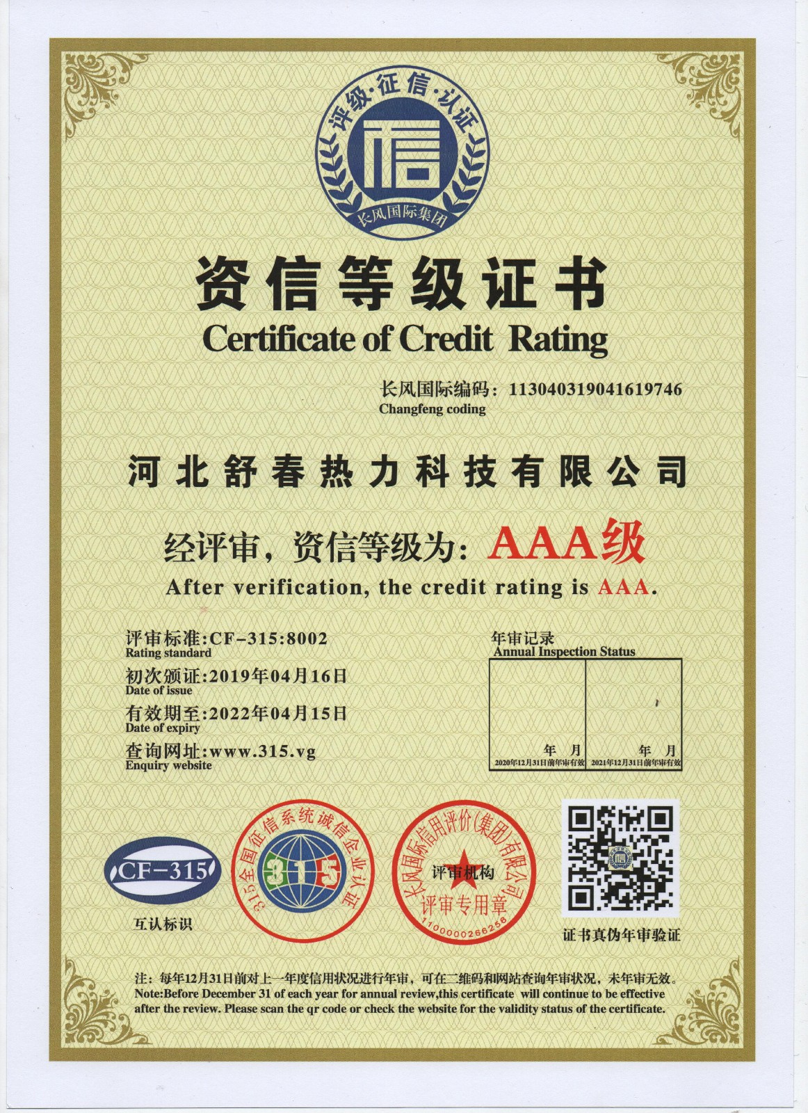 AAA級信用單位,舒春真誠對待每一個人 2019年4月16日,河北舒春熱力科技有限公司取得了AAA級信用單位、誠信經理人、誠信企業(yè)家、AAA級質量服務信譽單位、 AAA級重合同守信用單位、AAA級誠信經營示范單位、AAA級資信等級、AAA級信用等級。 |